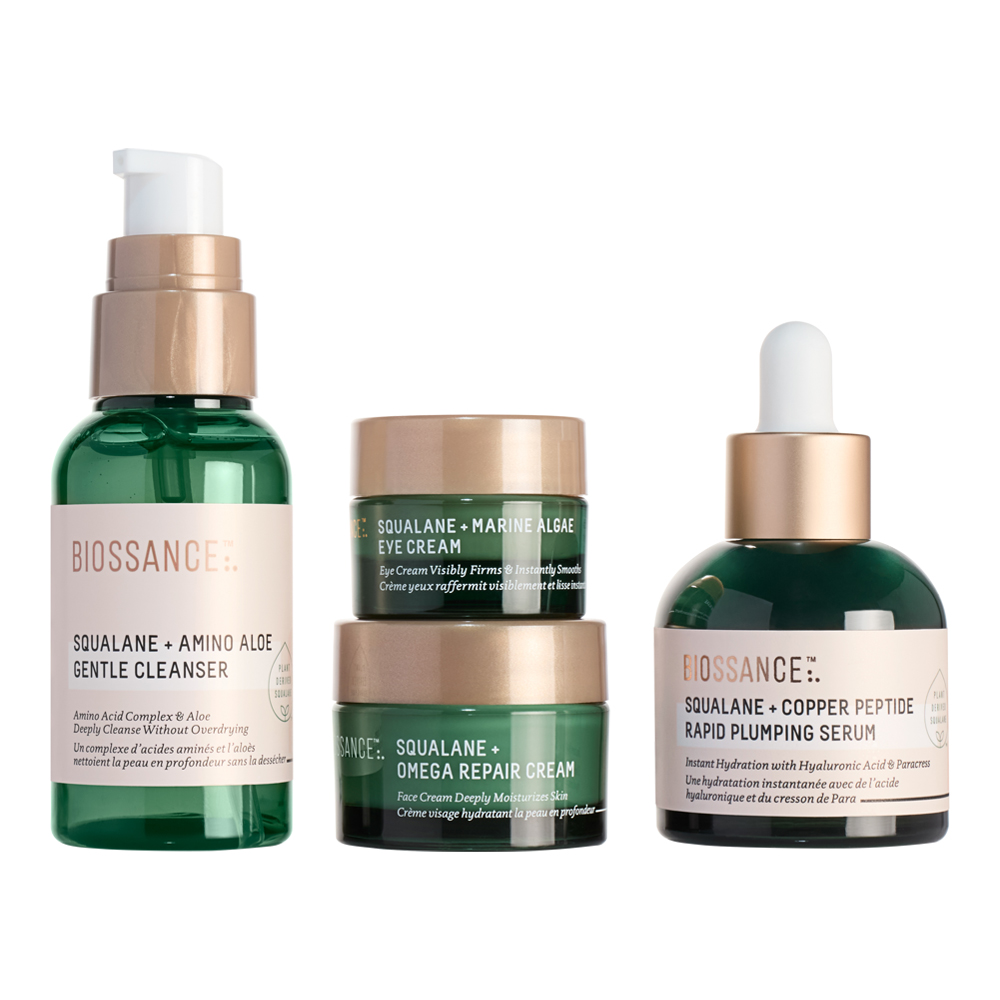 Wash away makeup, dirt, and help refine pores with our Amino Aloe Gentle Cleanser, then improve the look of firmness with melt-in moisturizing properties of an award-winning eye cream - Marine Algae Eye Cream, followed by visibly plump skin with our hyaluronic acid and peptide-powered Copper Peptide Rapid Plumping Serum, and finally lock in rich hydration with the bestselling moisturizer - Omega Repair Cream.