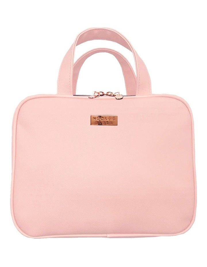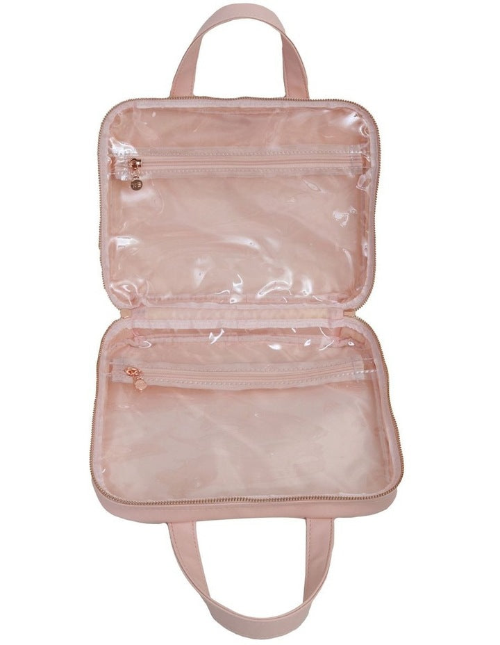 Ideal cosmetic bag for all your beauty needs. With two zipper pockets in the same direction, this bag can also be hung open from a door/hook and all your products will remain upright. With a rose gold zipper and pulley and rose gold branding patch, this bag is the ultimate in elegance and luxe.