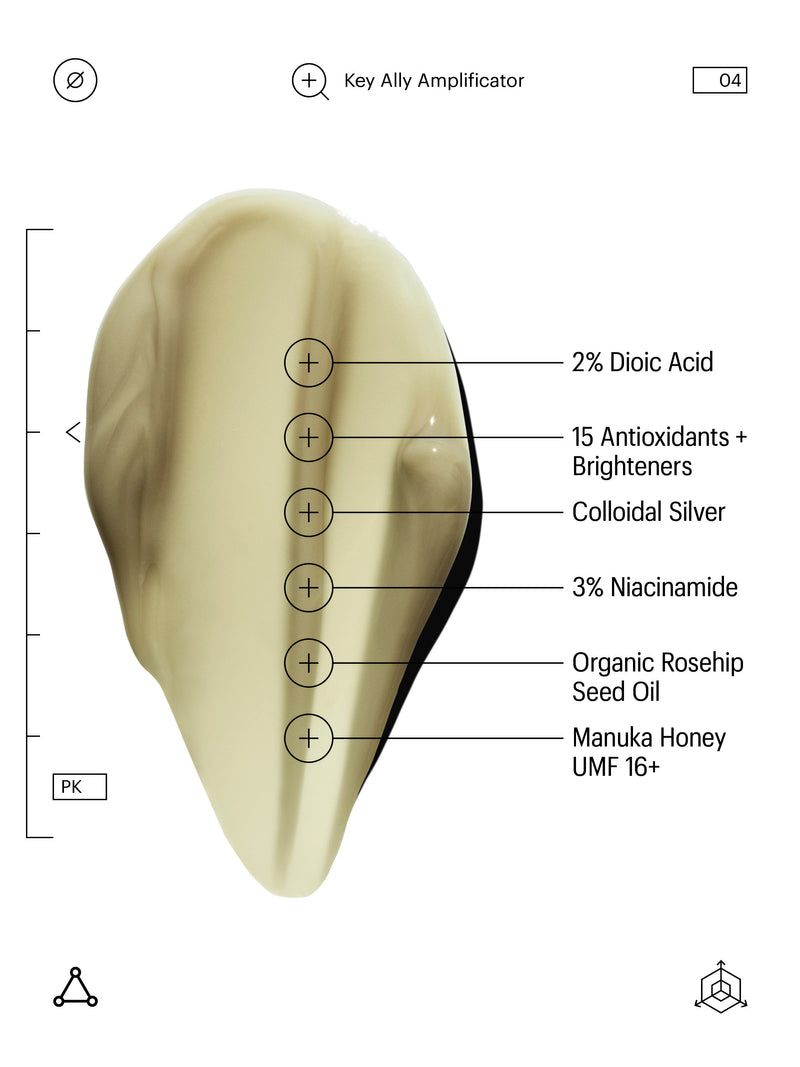 2% DIOIC ACID. A next-generation acid that helps reduce excess sebum, imperfections, and helps improve uneven skin tone.. . 5% POMEGRANATE ENZYMES & LILAC CELL COMPLEX. An antioxidant-rich complex that promotes gentle exfoliation and resurfacing of the skin while protecting against free radicals.. . HONEY UMF16. An antibacterial agent that soothes and protects the skin and has the ability to soak up and retain moisture.