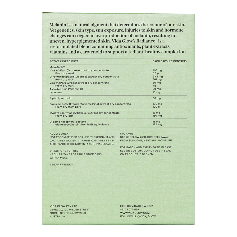 Radiance+ is a higher-performing capsule from Vida Glow’s Advanced Repair range that has been reformulated for more potent results. Looking at pigmentation as a leading cause of uneven skin tone, its superior blend of new and emerging actives works harder and faster to combat melasma, sun spots, age spots, dark spots and skin redness. Integrated into your everyday regime, Radiance+ enhances skin health for a radiant, even skin tone. The easy-to-consume capsules are tasteless, odourless and scientifically designed for optimal absorption, so you can reclaim your skin confidence. Powered by proprietary active Mela-tech™ French maritime pine bark, artichoke extract and alpha lipoic acid, Radiance+ addresses the overproduction of melanin. It is clinically proven to reduce dark spot intensity by 77% and reduce the size of melasma by 38% in weeks. Radiance+ utilises new and emerging actives that had not yet been studied at the time of the initial Radiance formulation. As the existing Radiance formulation was an award-winning and global favourite, the new formulation needed to create something even more transformative. Working harder, Radiance+ truly delivers results like you've never seen before.