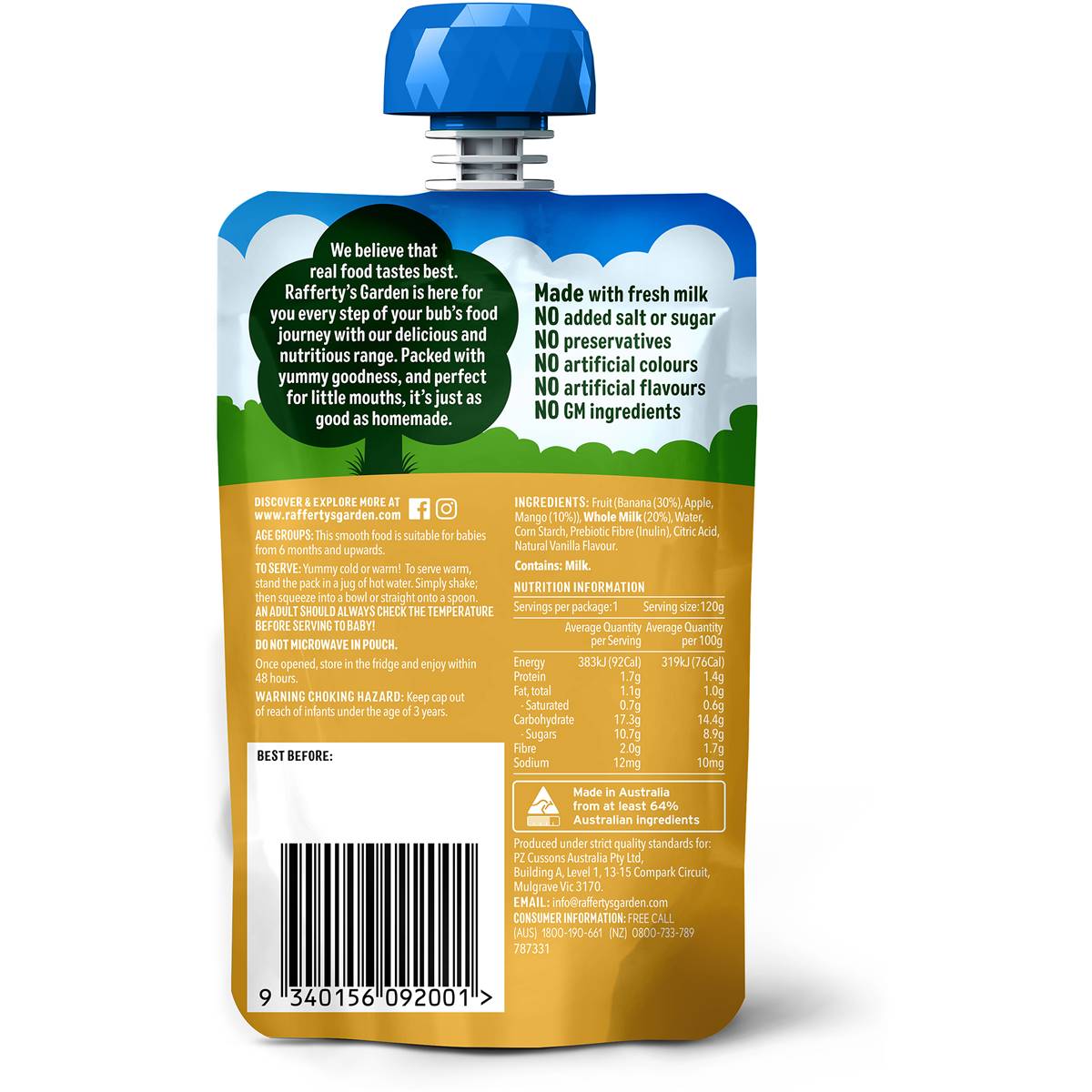 Rafferty's Garden Banana & Mango Custard Baby Food Pouch Dessert 6+ Months 120g