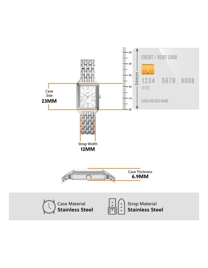 This 23mm Raquel watch features a silver satin dial, three-hand date movement and stainless steel bracelet.