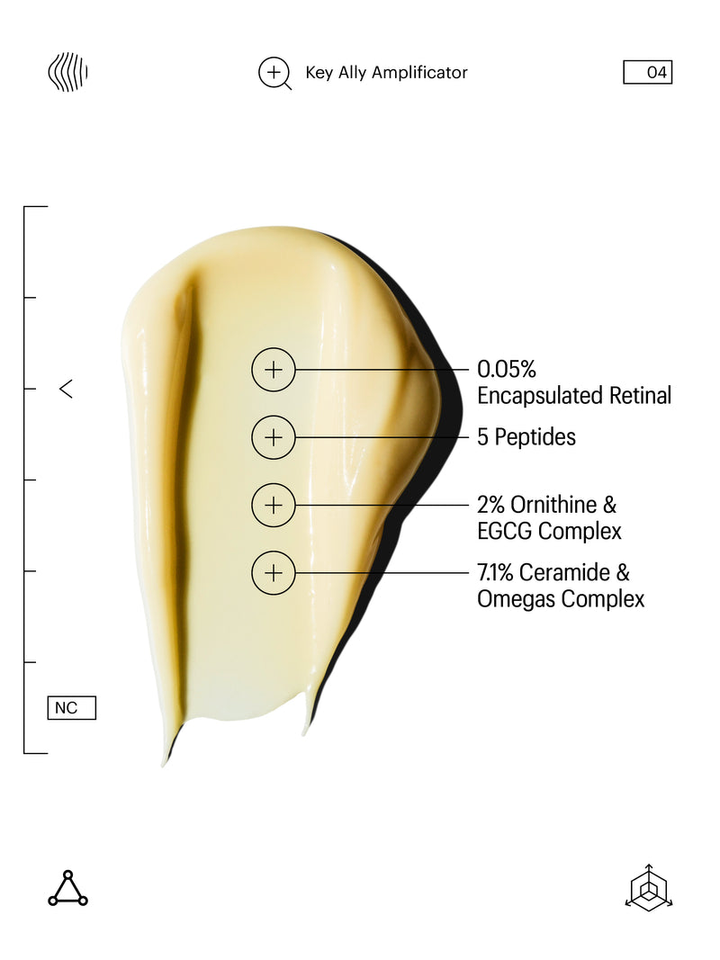 0.05% ENCAPSULATED RETINAL: The most bio-available, potent, and fastest-acting cosmetic Retinoid, to help improve the look of wrinkles, fine lines, photo damage, and uneven skin tone while being well-tolerated by the skin. . . 5 PEPTIDES: A powerful blend of Peptides that help reduce the appearance of wrinkles and fine lines for smoother and firmer looking skin. . . 2% ORNITHINE & EGCG COMPLEX: A combination of Amino Acids and antioxidants with firming, soothing, and calming properties. Reduces the appearance of structural aging and plumps the skin. . . 7.1% CERAMIDE & OMEGAS COMPLEX: A skin-loving combination that reinforces the skin barrier and helps to maintain its moisture balance while soothing the skin.