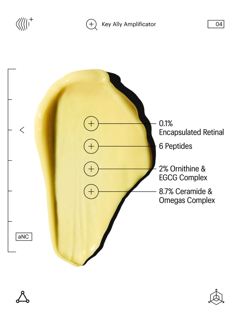 0.1% ENCAPSULATED RETINAL: The most bio-available, potent, and fastest-acting cosmetic Retinoid, to help improve the look of wrinkles, fine lines, photo damage, and uneven skin tone while being well-tolerated by the skin. . . 6 PEPTIDES . A powerful blend of Peptides that helps reduce the appearance of wrinkles and fine lines for smoother and firmer looking skin. . . 2% ORNITHINE & EGCG COMPLEX . An innovative combination of Amino Acids and antioxidants with firming, soothing, and calming properties. Reduces the appearance of structural aging and plumps the skin. . . 8.7% CERAMIDE & OMEGAS COMPLEX . A skin-loving combination that reinforces the skin barrier and helps to maintain its moisture balance while soothing the skin.