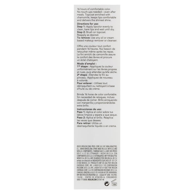Directions Step 1. Apply lipcolor evenly to clean, bare lips and wait until dry. Step 2. Brush on topcoat. Reapply as desired. To remove: Use any oil or cream based makeup remover or cleanser.