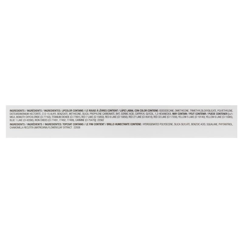 Ingredients Lipcolor: Isododecane, Dimethicone, Trimethylsiloxysilicate, Polyethylene, Disteardimonium Hectorite, C12-15 Alkyl Benzoate, Methicone, Silica, Propylene Carbonate, BHT, Sorbic Acid, Caprylyl Glycol, 1,2-Hexanediol. May contain: Mica, Bismuth Oxychloride (CI 77163), Titanium Dioxide (CI 77891), Red 7 Lake (CI 15850), Red 6 Lake (CI 15850), Red 27 Lake (CI 45410), Red 33 Lake (CI 17200), Yellow 5 Lake (CI 19140), Yellow 6 Lake (CI 15985), Blue 1 Lake (CI 42090), Iron Oxides (CI 77491, 77492, 77499), Carmine (CI 75470)) 22562. Topcoat contains: Hydrogenated Polydecene, Silica Silylate, Benzoic Acid, Squalane, Phytantriol, Chamomilla Recutita (Matricaria) Flower/Leaf Extract. 22938.
