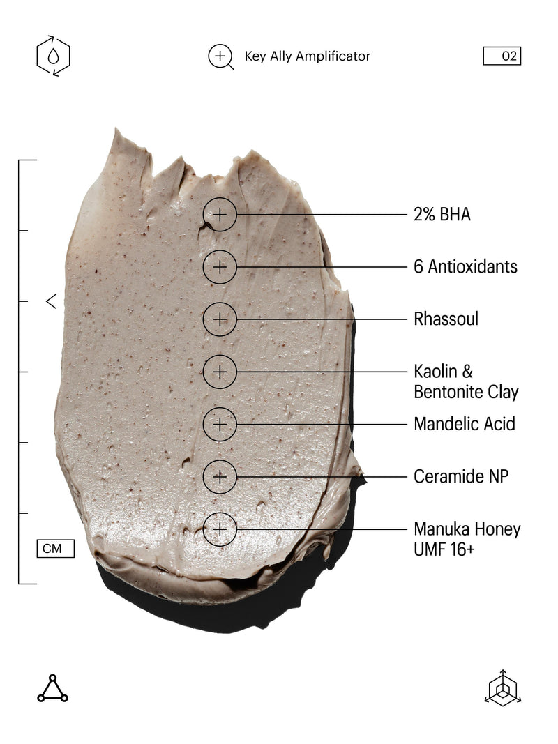 2% BHA: A lipid-soluble chemical exfoliant that provides deep exfoliation within pores to help decongest, unclog, and minimise future breakouts. . Rhassoul, Kaolin & Bentonite Clay : Mineral-rich clays that help to absorb pore-clogging impurities, and excess sebum, clarifying the skin.. Manuka Honey UMF 16+: An antibacterial agent that soothes and protects the skin, and has the ability to soak up and retain moisture. A UMF (Unique Manuka Factor) above 10 indicates a superior potency of Manuka Honey.