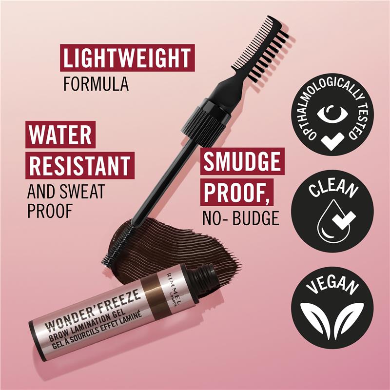 General Information Rimmel Wonder'Freeze Brow Lamination Gel is an all-in-one solution to tame, fluff & fix your brows for an all-day hold! It's a lightweight and flake-free formula that gives you natural fluffy-looking brows. The dual comb and brush applicators will help you achieve just the right amount of hold for the trending ultra-laminated brow look! Tame, fluff, & fix your brows, all in one with the Rimmel Wonder'Freeze Brow Lamination Gel! Get a fuller and thicker ultra-laminated brow look that lasts all day The comb shapes and the brush sculpts the brows evenly and ensures non-sticky and mess-free application Lightweight formula that creates perfectly natural-looking brows in just one swipe with the right amount of hold Flexible, flake-free and easily blendable, the formula feels comfortable on the brows An ophthalmologist-tested cruelty-free and vegan formula that is water, smudge, and sweat-proof Size: 6G KEY FEATURES • All day ultra-laminated brow hold for natural-looking fuller and thicker brows. • Lightweight, flexible, and flake-free formula to style brows as desired. • Water-resistant, sweat-proof, and smudge-proof. • Dual comb and brush applicators that ensure easy non-sticky and mess-free wax application to shape and sculpt brows.