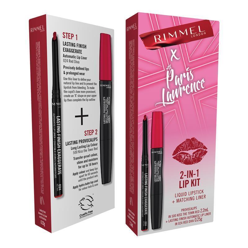 General Information The ultimate lip loving duo for the perfect non-transfer & high-impact pout! Using Rimmel London's best-selling Lasting Finish Automatic Liner in the shade #024 Red Diva and Rimmel London Lasting Provocalips in the shade #500 Kiss The Town Red Rimmel London Lasting Provocalips: a 2-step liquid lipstick for locked-in, high impact colour & moisture. It provides transfer-proof colour, shine, and hydration that lasts up to 16 hours. The 2-step lip care application starts with colour-intense liquid, followed by a hydra-balm top coat to keep the make-up in place. Comfortable on your lips, it won't cake, flake or dry-out. Gentle, mess-free, precise application. Lasting Finish Automatic Liners: Now it’s easier than ever to shape and lock your lip-look in place with new?Lasting Finish Exaggerate Automatic Lip Liner?from Rimmel London. It delivers precisely defined lips and helps your?lippie stay put for longer. The?creamy formula in this liner pencil features a combo of waxes and?oils that give a?smooth?and even?application.?The automatic twist-up format never needs sharpening