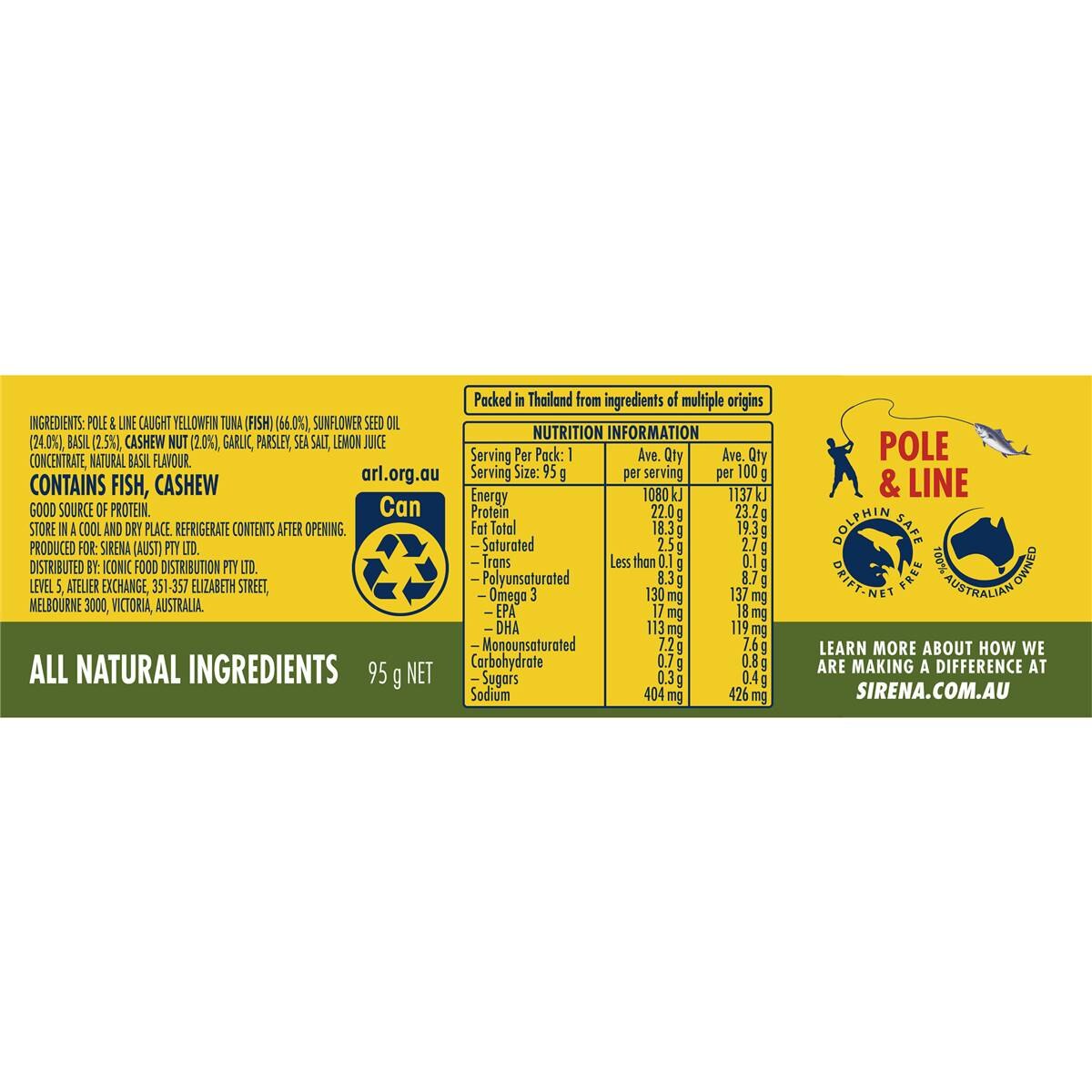 Succulent Sirena chunk tuna in a traditional Italian pesto sauce.