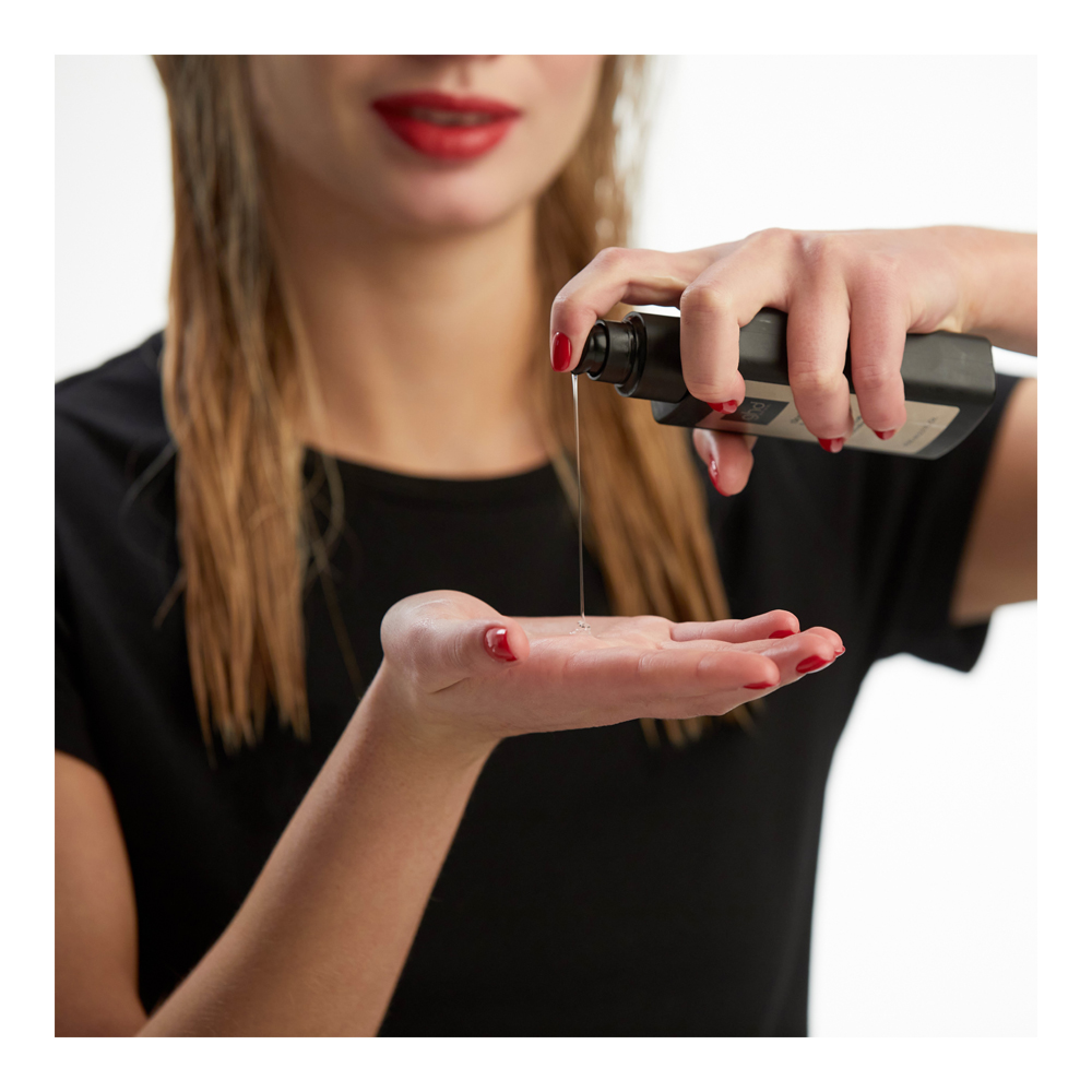 Apply 2 pumps into the mid-lengths and ends to wet hair before heat styling.