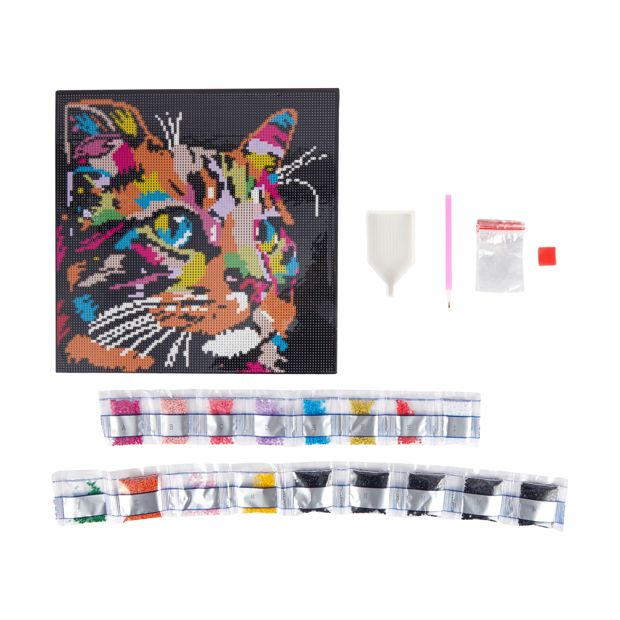 Product DetailsIncludes 1 x adhesive canvas, coloured gems and tool setDimensions/Size:Adhesive canvas: 30cm (H) x 30cm (W) Coloured gems packs: 6.7cm (H) x 6cm (W)FeaturesNeon cat designFor DIY craft