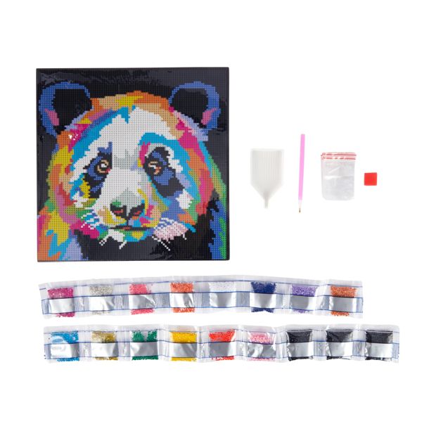Product DetailsIncludes 1 x adhesive canvas, coloured gems and tool setDimensions/Size:Adhesive canvas: 30cm (H) x 30cm (W) Coloured gems packs: 6.7cm (H) x 6cm (W)FeaturesNeon panda designFor DIY craft