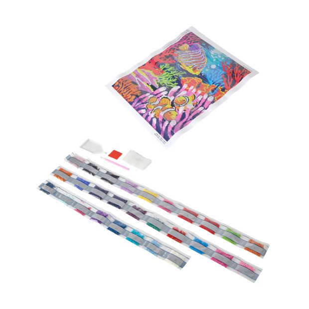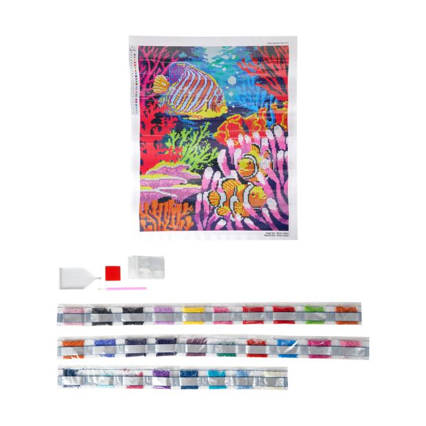 Product DetailsIncludes 1 x canvas, coloured gems and tool kitDimensions/Size:Pack size: 50.5cm (H) x 9.8cm (W) x 3.1cm (D)Canvas: 50cm (H) x 40cm (W)FeaturesSea life designFor craft DIY