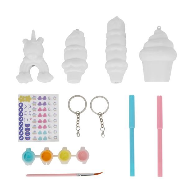 Product DetailsSuitable for ages:3+ yearsIncludes 4 x squishies, 2 x keyrings, 4 x paints, 2 x markers, 1 x paint brush and 1 x sticker sheetNet volume:Paint: 2ml (Each)Dimensions/Size:26.5cm (H) x 22cm (W) x 6cm (D)FeaturesMakes 2 keyrings and 2 pen toppersCustomise your own squishies