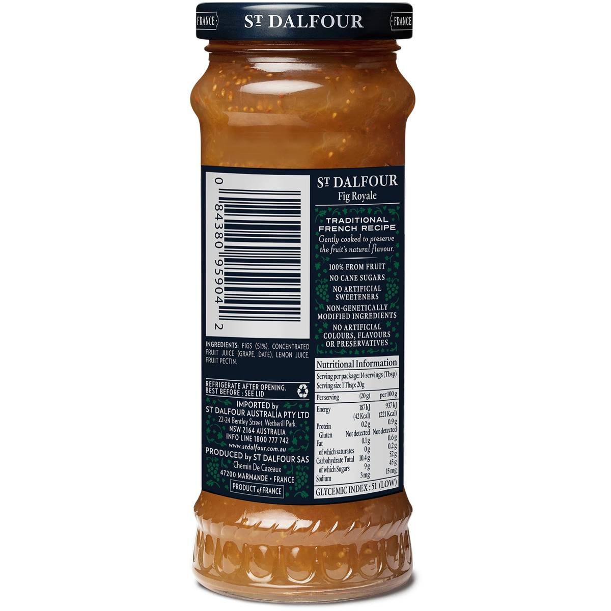 St Dalfour Royal Fig Fruit Spread. Hand crafted in France from a traditional family recipe. Decadent figs with a clean finish and delightful texture. Pairs well with cheese, prosciutto and pears. 100% from fruit. No cane sugar. No artificial sweeteners. No artificial colours. Sweetened only with vineyard ripened grape and fruit juices. Gluten Free. Vegan.