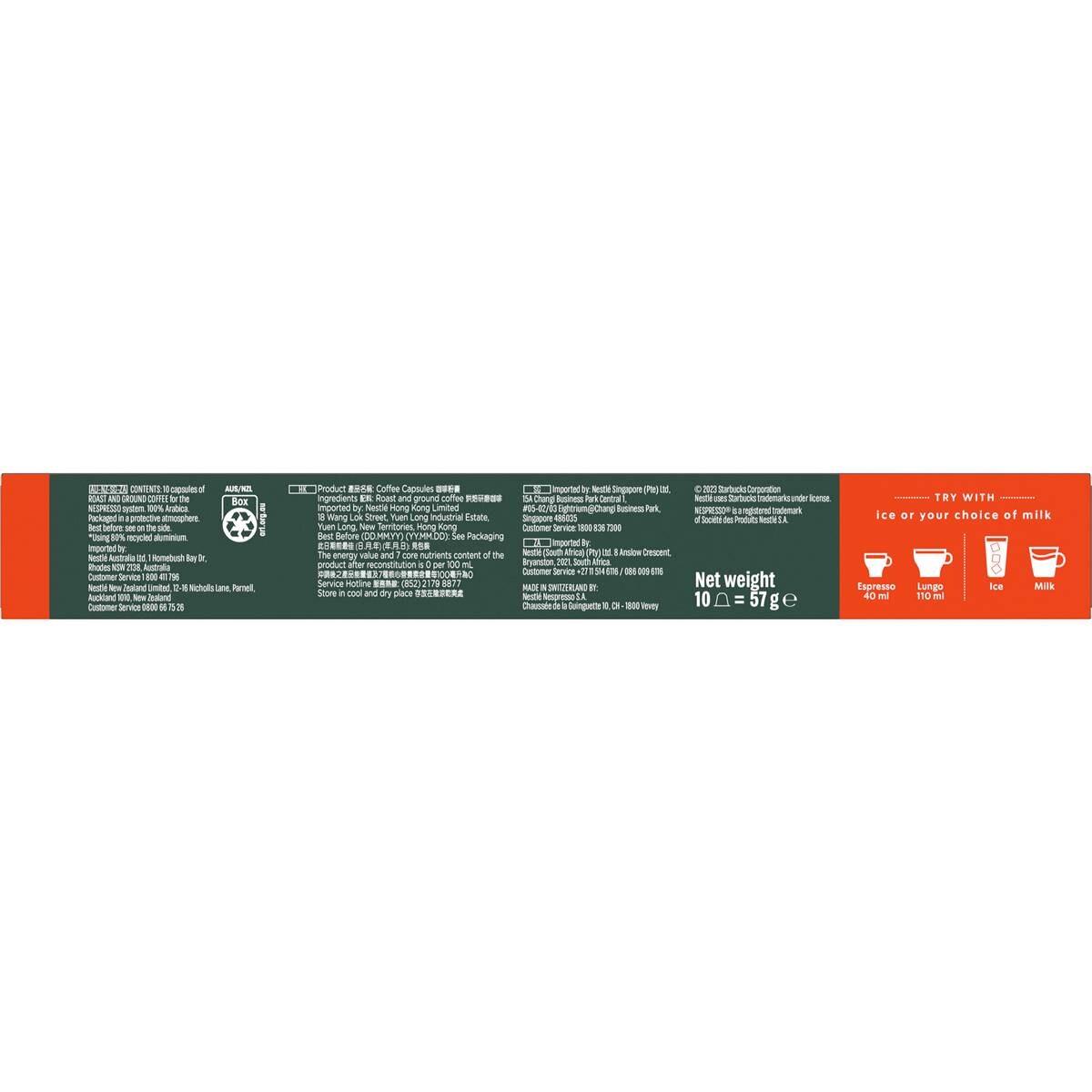 We’ve always loved coffee from Colombia. And we’re never reminded of that love more than when we’re travelling to the coffee farms. Driving treacherous dirt roads with a sheer mountain wall to one side – nothing but air for thousands of feet to the other. For us, the round body, juicy taste and signature nutty finish of this 100% Colombian coffee are worth the journey every time.Years of focus and expertise have led to the Starbucks Roast Spectrum. Each coffee bean requires a unique balance of temperature and time to reach its individual peak of aroma, acidity, body and flavour.Medium Roast: Smooth and balanced, our medium-roast coffees have a little kick and deliver a medium-bodied cup with a hearty roast.Enjoy Starbucks at home. The coffee you love without leaving the house.Coffee capsules for Nespresso coffee machines.Balanced & Nutty notes. This 100% Colombian coffee has a round body, juicy taste and signature nutty finish.Intensity: 7Cup Recommendation: Espresso (40ml) or Lungo (110ml)Committed to 100% Ethical Coffee Sourcing in partnership with Conservation International.For Nespresso Machines.