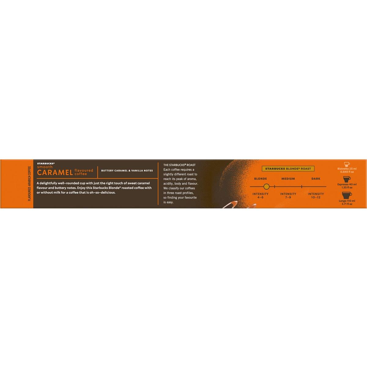 STARBUCKS by Nespresso Smooth Caramel Flavoured Coffee Pods 10pkSmooth, buttery caramel and vanilla notes are waiting in every well-rounded cup of Starbucks® Smooth Caramel by Nespresso®. It's the darker side of our blonde roast, to be enjoyed at the touch of a button - with or without milk for an oh-so-delicious cup for your next Starbucks® moment.• STARBUCKS coffee Pods by NESPRESSO with smooth & sweet notes• Intensity: 6• Coffee Pods compatible with NESPRESSO coffee machines• Enjoy STARBUCKS at home. The coffee you love without leaving the house