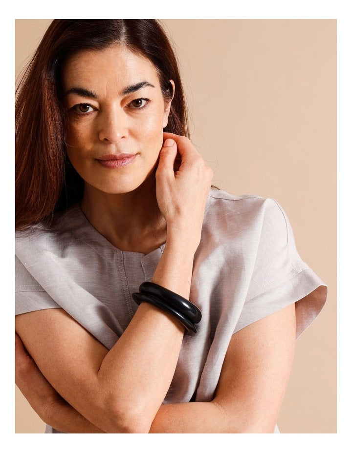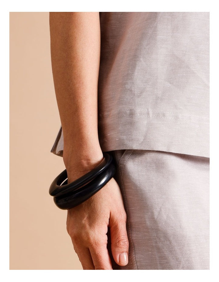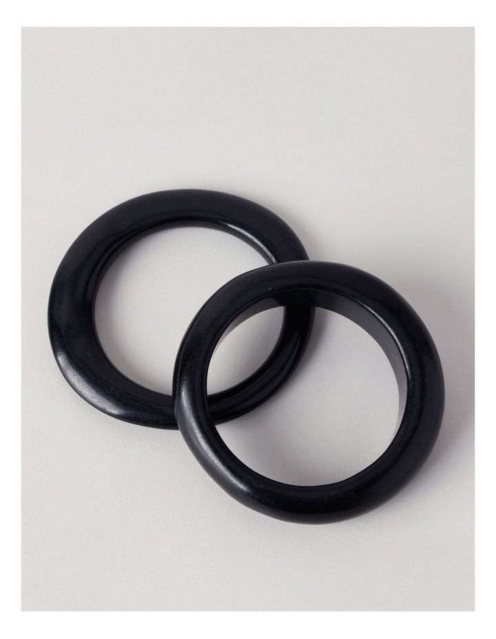 This set features a pair of statement bangles in a versatile black hue. Designed with a bold and contemporary aesthetic, these accessories are intended to be a noticeable element of any ensemble. The matching duo can be worn stacked together for a more impactful look or styled individually for a touch of modern simplicity, offering versatile options for accessorizing.