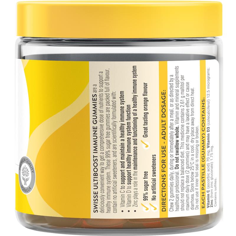 General Information The upkeep of a healthy immune system can sometimes be a challenge, particularly when it comes to supplementation. Our Swisse Ultiboost Immune Gummies offer a tasty and convenient alternative to tablets so you can support your immune system to fight off illness. Containing zinc, Vitamin D, and Vitamin C, these delicious gummies offer on-the-go support for your immune system. Our immune system is something we can often take for granted until illness strikes. Luckily, supporting your immune system has never been more convenient with Swisse Ultiboost Immune Gummies. With a delicious orange flavour, you can help maintain your immune health year-round with this delicious format. Each gummy contains vitamins C and D3 and zinc and are 99% sugar free. We recommend chewing two gummies daily during or immediately after food. Suitable For: Adults Size: 60 Pack KEY FEATURES • Great tasting orange flavour. • Contains zinc and Vitamin C for supporting immune system health. • Convenient alternative to tablets. • 99% sugar free.