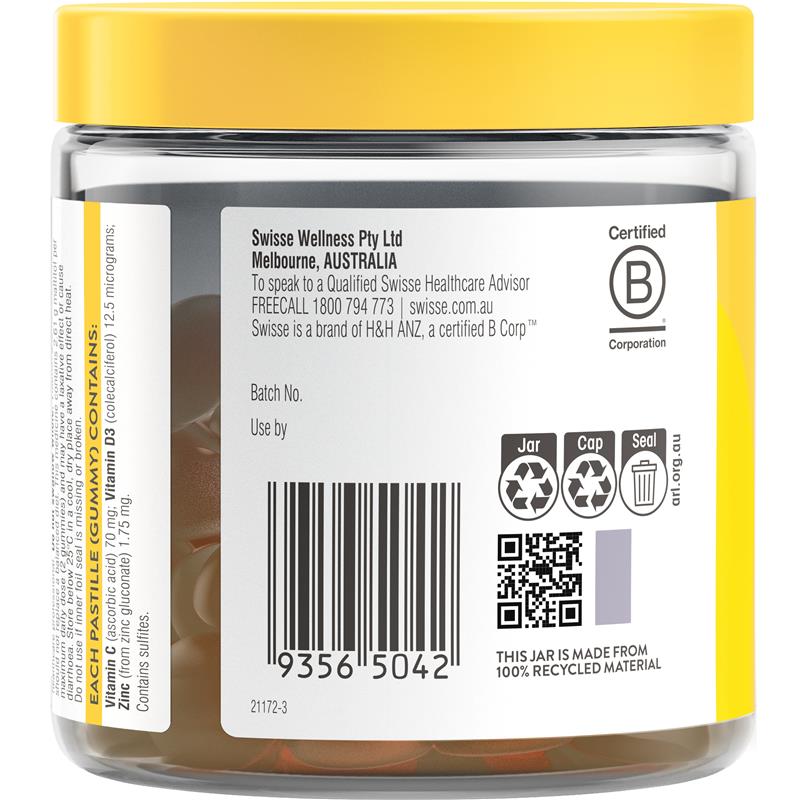 Ingredients EACH GUMMY (PASTILLE) CONTAINS: Vitamin C (ascorbic acid) 70 mg; Vitamin D3 (colecalciferol) 12.5 micrograms; Zinc (from zinc gluconate) 1.75 mg Contains: Contains sulfites.