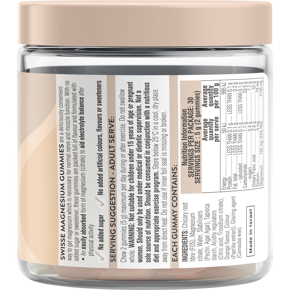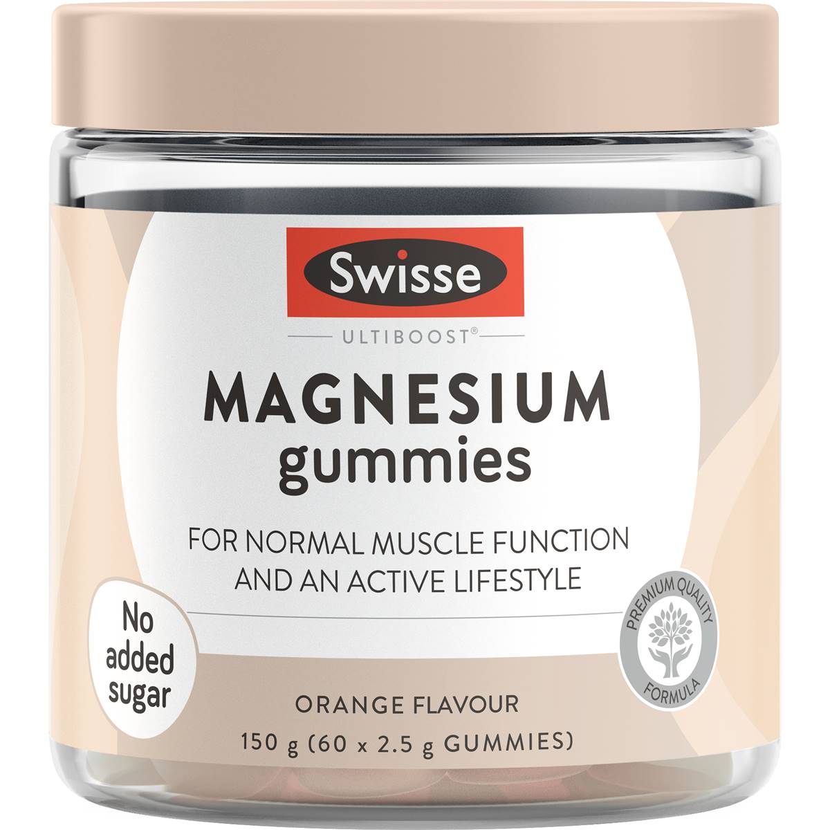 Swisse Magnesium Gummies are a convenient way to obtain a nutrient which is necessary for normal nerve and muscle function for your active lifestyle. Enjoy the benefits of these delicious, orange flavoured gummies, making your wellness routine both enjoyable and effortless. Discover the benefits of Swisse Magnesium Gummies, a convenient way to get magnesium into your diet. Each two-gummy serving contains 105mg of magnesium to aid electrolyte balance after physical activity. They contain magnesium from magnesium citrate, which is an easily absorbed form of magnesium, without any added sugar. Enjoy the delicious orange flavour packed in every gummy while supporting your active lifestyle.SERVING SUGGESTION - ADULT:Chew two 2 gummies daily, during or immediately after a meal, or as directed by a healthcare professional. Do not swallow whole.Contains magnesium to support nerve and muscle function.Free from added sugar and has a delicious orange taste.Convenient gummy format, ideal for on-the-go.