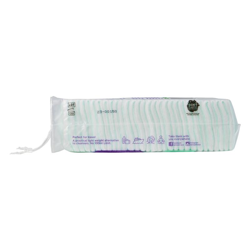 General Information ACTIVATE WITH WATER! Swisspers® 3 in 1 cleanser pads are infused with Aloe Vera and antioxidant-rich Vitamin E. The dual sided-pad allows you to both cleanse and hydrate; leaving your skin feeling refreshed and moisturised, anytime - anywhere! Dermatologically and Ophthalmologically tested, making them suitable for sensitive skin types and even the most delicate eye area. • Removes waterproof make-up & mascara • Cleanses • Hydrates Take them with you everywhere. Perfect for travel! A practical lightweight alternative to cleansers. No 100ml Limit. Packaging made from 50% recycled materials. The REDcycle scheme is no longer operational. Unfortunately, this means that there is no collection of soft plastics available for customers at the present time. Industry is working hard to identify pathways to create new scheme(s). In the meantime, customers are advised to dispose of their soft plastics in the landfill bin. Thank you for your understanding. Boxed Contents: 1 Size: 60 Pack KEY FEATURES • ACTIVATE WITH WATER! • 3 in 1 cleanser pads are infused with Aloe Vera and antioxidant-rich Vitamin E • Dual sided-pad allows you to both cleanse and hydrate • Leaves your skin feeling refreshed and moisturised • Dermatologically and Ophthalmologically tested • Suitable for sensitive skin types and even the most delicate eye area • Removes waterproof make-up & mascara • A practical lightweight alternative to cleansers