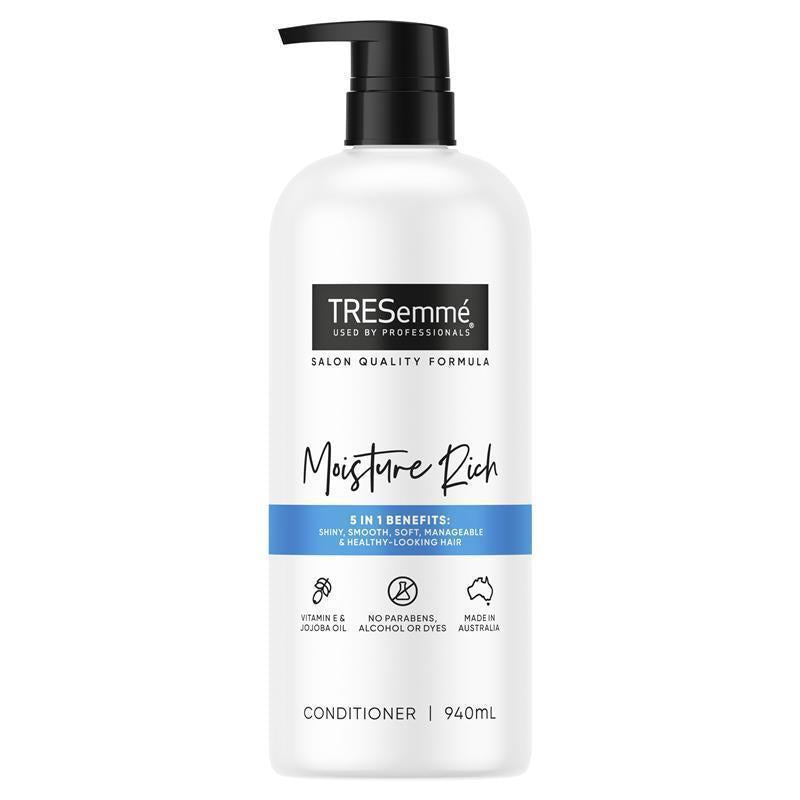 General Information Tresemme CONDITIONER MOISTURE RICH 940 ML TRESemme Moisture Rich Conditioner is enriched with vitamin E and jojoba oil to deliver intense moisturisation with 5 in 1 benefits: shiny, smooth, soft, manageable and healthy-looking hair. Free from parabens, alcohol and dyes, this nourishing formula is light enough for daily use, with a moisture-balanced system that transforms dry and damaged hair. For best results, use our moisturising conditioner after shampooing with TRESemme Moisture Rich Shampoo. Apply through hair, running a wide tooth comb or fingers from root to tip to detangle. Leave on for 2-3 minutes then rinse thoroughly before styling with your favourite TRESemme products. Since our salon beginnings in 1948, TRESemme has been creating professional-quality hair care products to help you achieve the look and style you want, every time. TRESemme understands how great hair gives you the confidence to walk taller every day. Inspired by stylists and tested in salons, the products are designed to help you achieve a salon-gorgeous hairstyle at home. TRESemme delivers salon-quality formulas without the salon price tag. Our bottles are made in Australia, with 50% Australian Recycled Plastic and are recyclable. TRESemme does not test on animals and is PETA approved worldwide. To learn more about the range or access stylist tips and tricks, visit the TRESemme website. Boxed Contents: 940 mL Size: 940 mL KEY FEATURES • TRESemme Moisture Rich Conditioner is specially formulated for dry and damaged hair, delivering intense moisturisation to keep hair looking healthy • Features 5-in-1 benefits: shiny, smooth, soft, manageable and healthy-looking hair • Enriched with vitamin E and jojoba oil to transform dry hair into silky, salon-quality locks • Our professional-quality conditioner contains no parabens, alcohol or dyes • For best results, use after TRESemme Moisture Rich Shampoo, applying from root to tip to detangle and nourish dry hair • Our moisturising conditioner is made in Australia and PETA approved