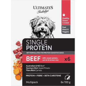 Ultimates Single Protein Dog food is vet formulated for protein sensitive dogs. Using one high quality protein source, combined with nutrient rich vegetables & gently steamed it is a nutrient rich meal for your best mate. Ultimates Single Protein is vet formulated, using one high- quality protein source to support dogs with food sensitivities. Combined with nutrient- rich vegetables and gently steamed to preserve essential nutrients, this recipe promotes digestive health, sustained energy, and overall wellbeing. Suitable for adult and senior dogs across all breeds, it contains no artificial colours, flavours or preservatives, just wholesome nutrition you can trust.