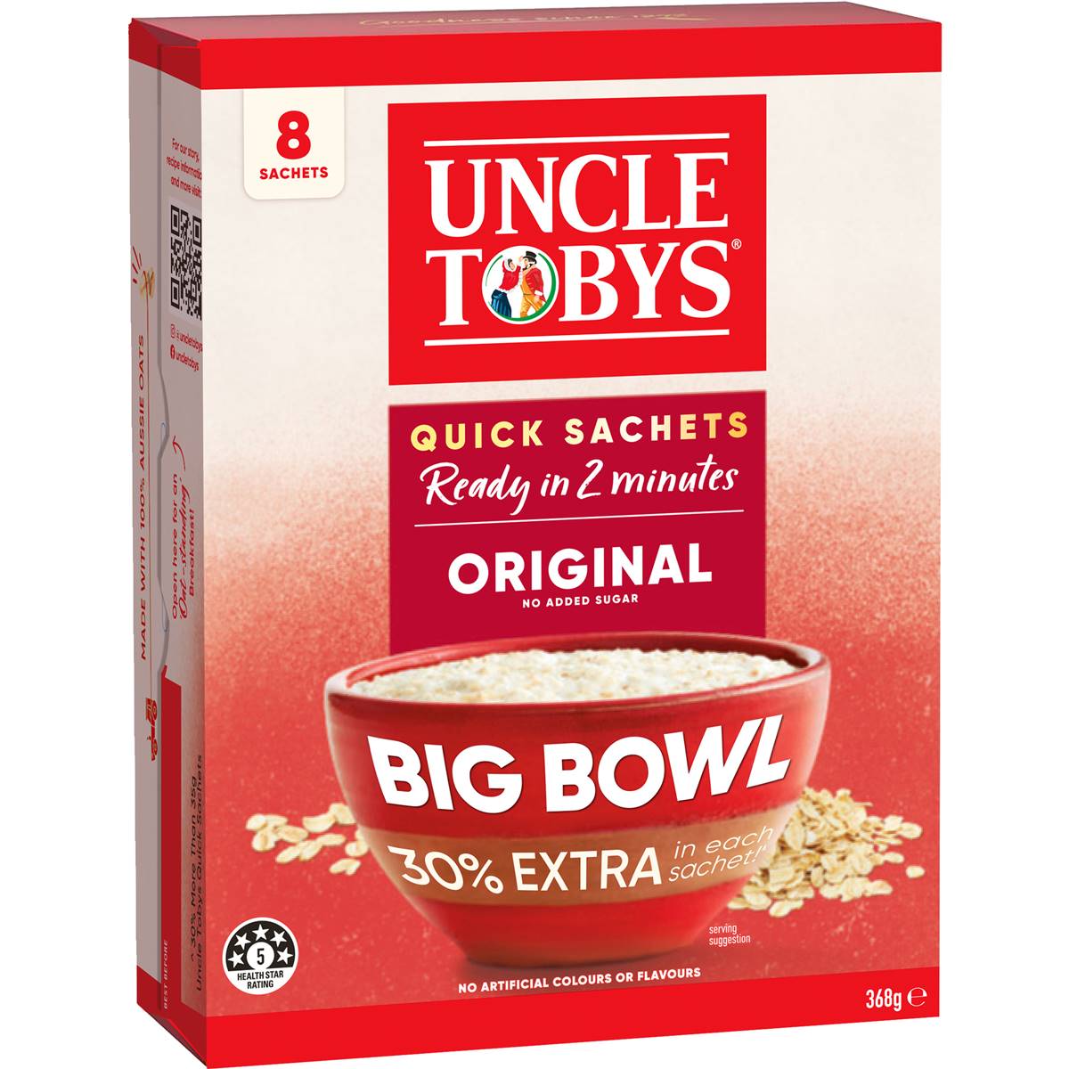 UNCLE TOBYS OATS Quick Sachets Big Bowl Original Porridge 368gEnjoy an 'Oat-standing' Breakfast! UNCLE TOBYS Big Bowl Original Quick Sachets a naturally creamy and healthy breakfast made from 100% Australian Rolled Oats specially cut and rolled to make a creamy bowl of porridge in 2 minutes!They’re perfect for a delicious bowl of porridge topped with a drizzle of honey or fresh berries, overnight oats, smoothies, baking and more! For over 130 years, UNCLE TOBYS has been proudly producing quality oats. They source their oats from local farmers and produce their delicious products in Wahgunyah VIC, Australia.Healthy eating, supported by an active lifestyle, makes for a happier life. By continuing to serve families and communities, and supporting local farmers, UNCLE TOBYS are committed to the health and happiness of future generations. UNCLE TOBYS, experts in oats since 1893.100% Australian Oats