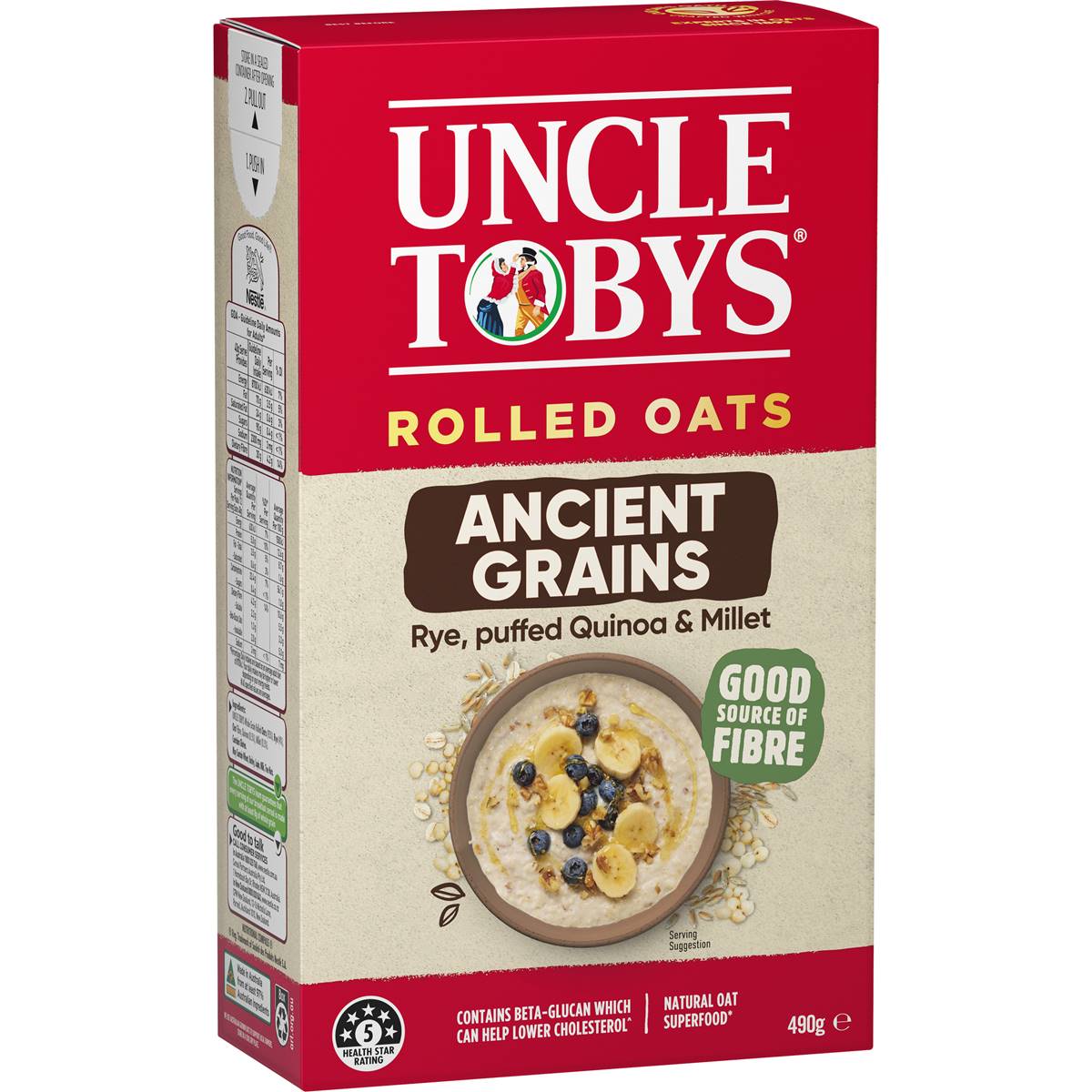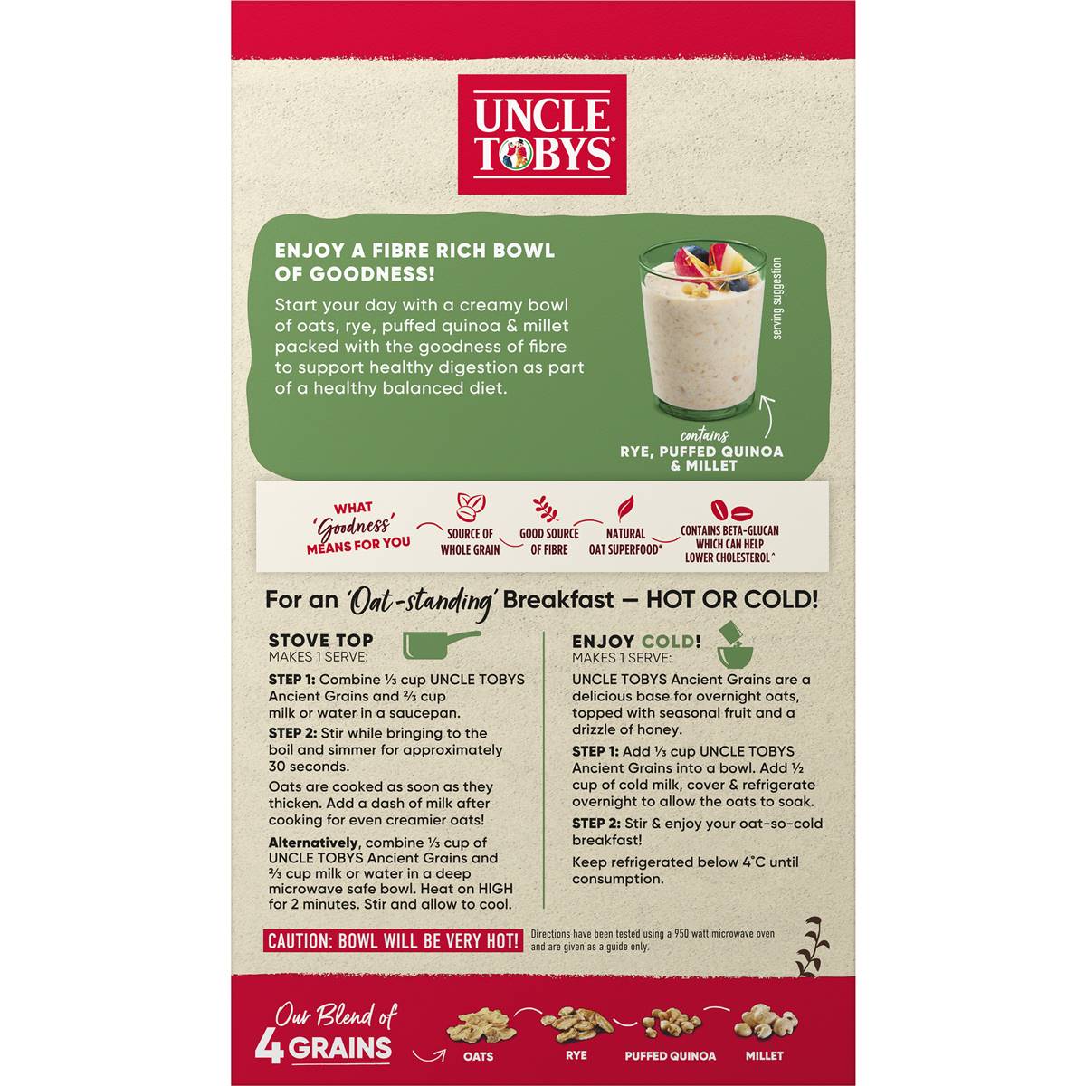 Enjoy an 'Oat-standing' Breakfast! UNCLE TOBYS Ancient Grains are a blend of 100% Australian Rolled Oats with rye, puffed millet and quinoa with the added goodness of Oat Fibre.Containing oats as a natural superfood*, UNCLE TOBYS Ancient Grains provide a good source of fibre to support healthy digestion as part of a healthy balanced diet.Enjoy UNCLE TOBYS Ancient Grains in a delicious bowl of porridge topped with a drizzle of honey or fresh berries, overnight oats, smoothies, baking and more! Did you know UNCLE TOBYS Ancient Grains are FODMAP Friendly? If you follow a low FODMAP diet, this product has been FODMAP Friendly Certified so you can enjoy it with confidence. If following a low FODMAP diet, ensure you use a low FODMAP milk alternative such as lactose-free or almond milk.For over 130 years, UNCLE TOBYS has been proudly producing quality oats. They source their oats from local farmers and produce their delicious products in Wahgunyah VIC, Australia.Healthy eating, supported by an active lifestyle, makes for a happier life. By continuing to serve families and communities, and supporting local farmers, UNCLE TOBYS are committed to the health and happiness of future generations. UNCLE TOBYS, experts in oats since 1893.*Oats are a Natural Superfood as they are:- 100% whole grain- A source of protein- A source of fibre- A source of natural energy- A source of beta-glucan, which helps lower your cholesterol^.^as part of a healthy diet low in saturated fats, 3g of beta-glucan each day helps lower cholesterol 100% Australian Oats